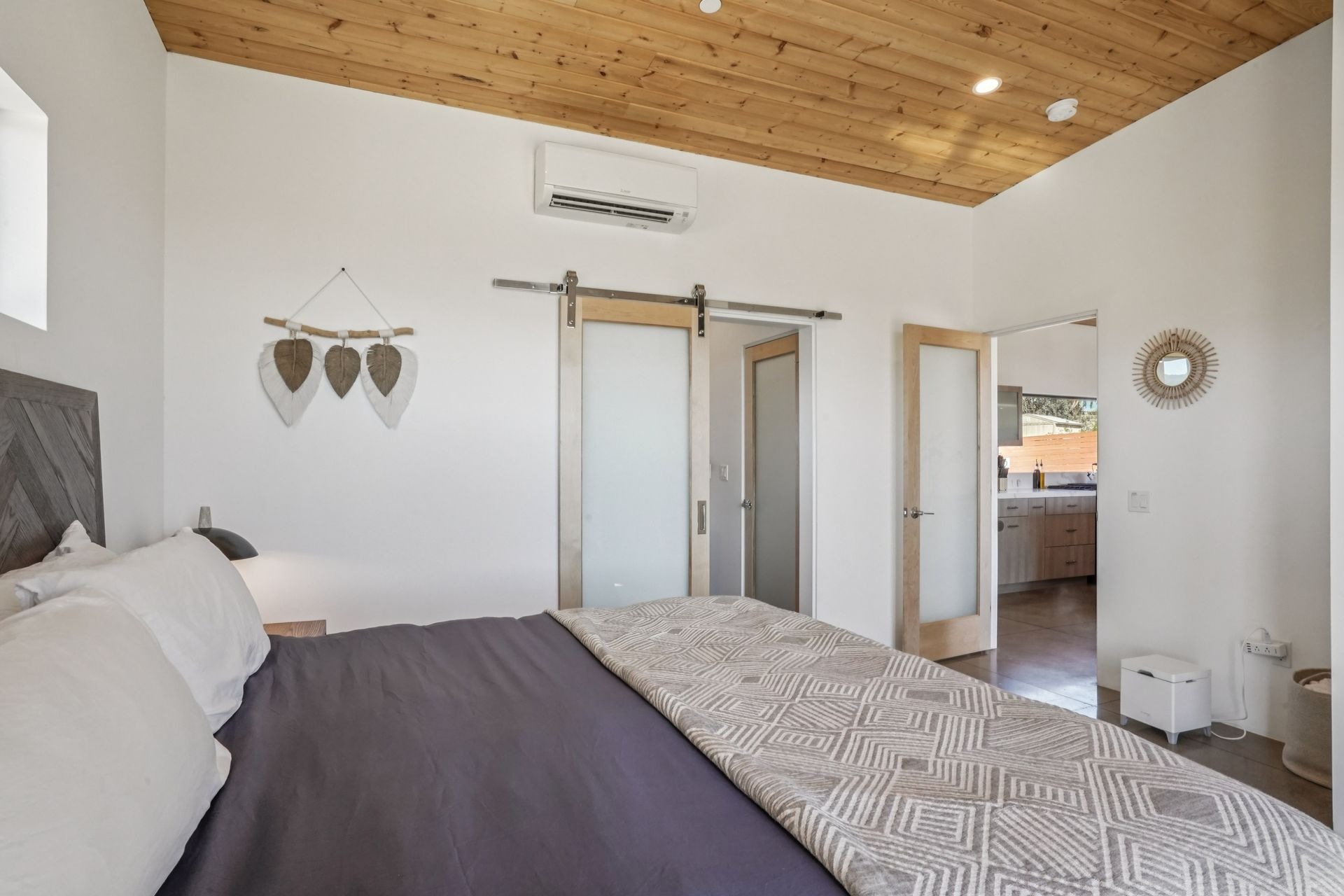 This modern retreat features 2 bedrooms and 2 bathrooms across 1,196 square feet of thoughtfully designed living space on 1.25 acres. Solar panels provide sustainable energy efficiency while sophisticated smart technology enhances everyday convenience. The open floor plan showcases a gourmet kitchen with island and stone counters, seamlessly blending form and function. Both bedrooms are situated on the main level for single-story living. With ductless heating and cooling, a gas fireplace, and carport parking, this turnkey residence offers the perfect blend of contemporary design and comfortable living.